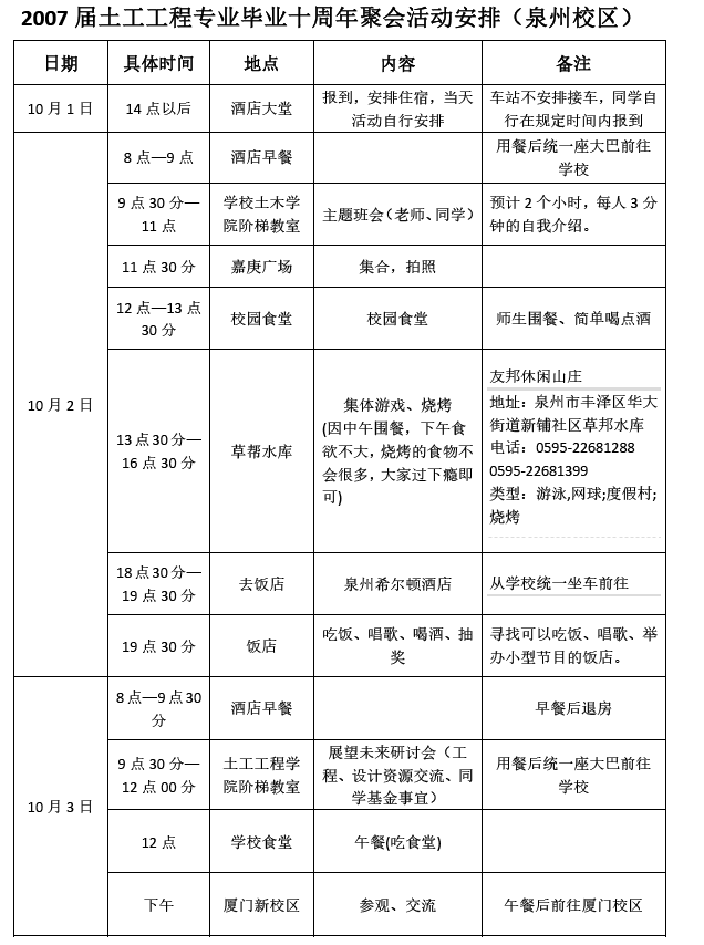 2017年10月1日-3日,2007届土木工程专业校友毕业十周年拟返校聚会,地点泉州校区。