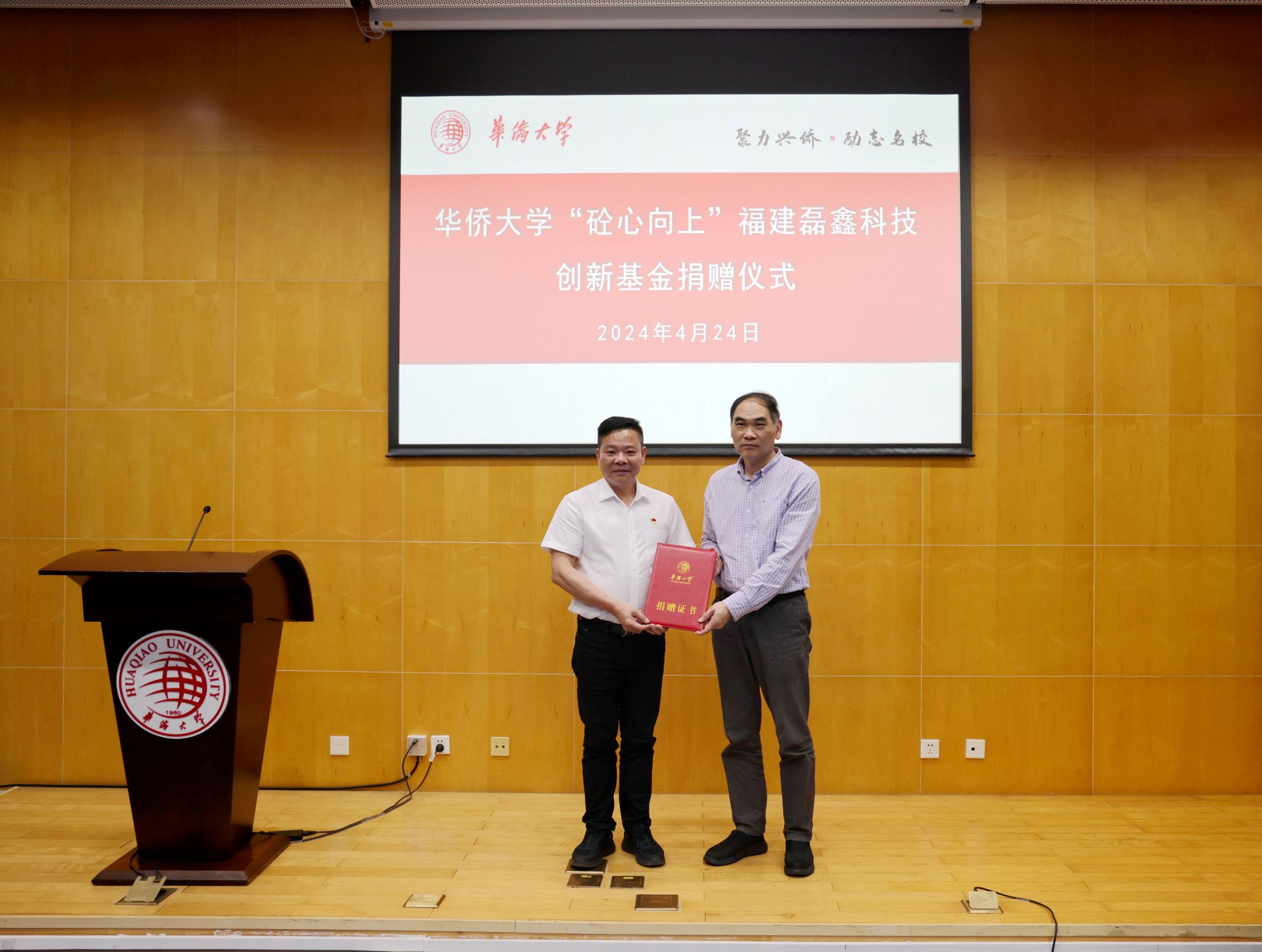 在现场嘉宾和师生代表的见证下,校董事会办公室负责人和卢荣智共同签署捐赠协议,王秀勇并向卢荣智颁发捐赠证书。