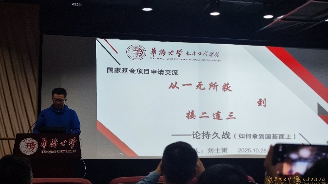 会上,刘士雨教授以“从一无所获到接二连三——论持久战(如何拿到国基面上)”为题,结合自己近五年成功获批三项国家自然科学基金面上项目的经历,系统分享了其成功经验与心路历程。他重点阐述了在选题创新、研究基础积累等方面的具体做法,为与会教师提供了极具参考价值的申报思路与策略指引。