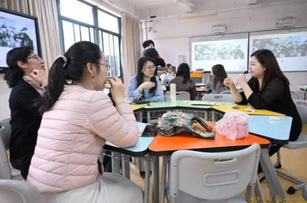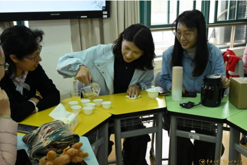 在实操体验环节,郑老师分组指导大家进行茶艺实操,为增强体验感与趣味性,实操过程中同步开展了简易茶艺文化品鉴赛。老师们亲手拿起盖碗、公道杯,从温杯洁具、投茶注水到出汤分茶、品茗观香,一步步学习标准的茶艺动作,在动手实践中体会泡茶的乐趣,在茶汤的香气中放松身心。品鉴赛现场,大家以茶为媒,在完成基础茶艺操作后,互相品鉴彼此冲泡的茶汤,从汤色、香气、滋味三个维度交流评价,现场茶香四溢、笑语盈盈,既有实操的专注,也有赛事的热烈。学院的外籍教师也积极参与其中,不仅亲手体验中国传统茶艺操作,还主动加入品鉴赛,在品尝不同冲泡手法的茶汤、聆听茶文化讲解的过程中,直观感受中华文化的独特魅力,沉浸式领略中式茶韵的雅致与深厚。