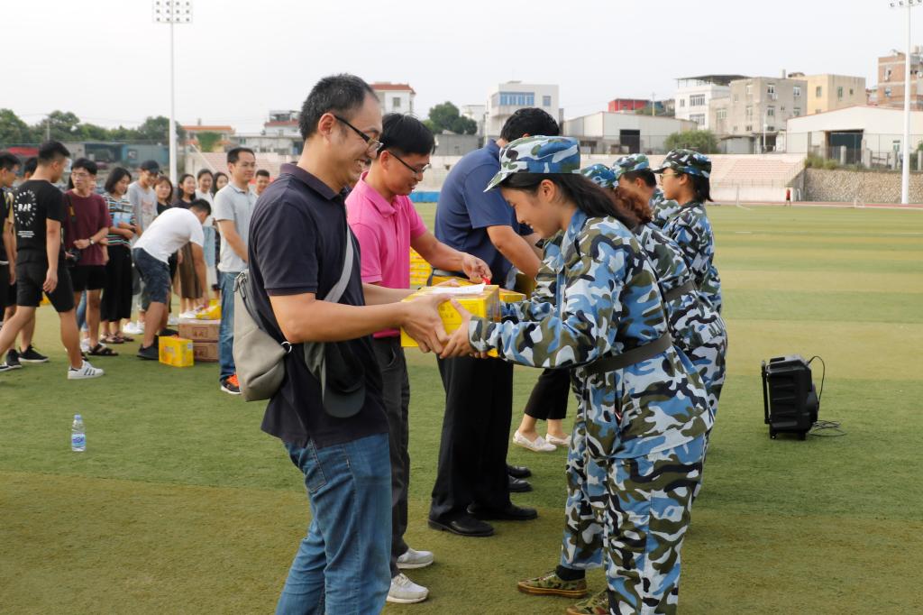 两院领导及2018级班主任为参训同学们送上慰问品,希望大家以百分百的气势,听从教官的指挥,向先进连的目标冲刺。