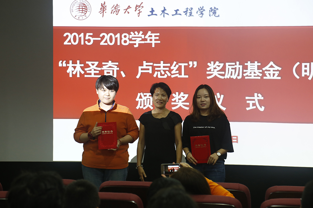 荣获2015-2018学年科技创新一等奖的钱佳敏同学和艺术创新一等奖文娱部团队代表的孙小乔同学代表全体获奖同学上台接受颁奖并与卢志红女士合影留念,学生代表柯永贤上台献花表达对卢志红校友捐资助学的感激。