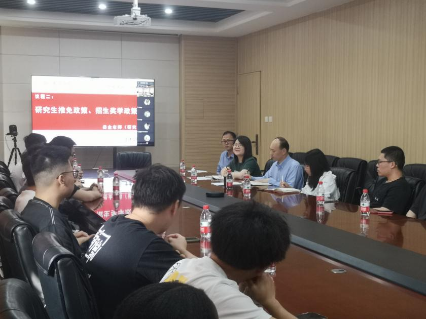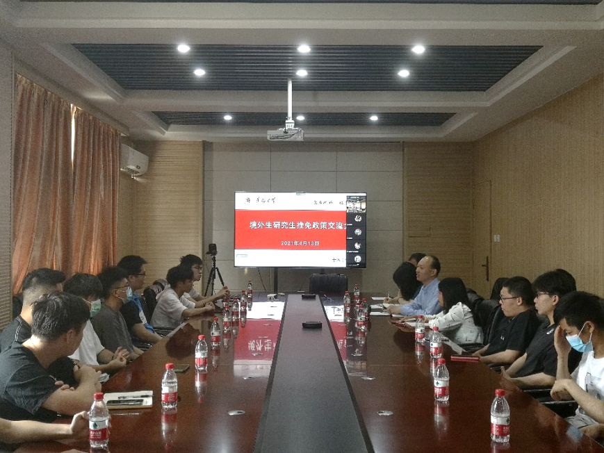 研究生院岳金老师对学校相关推免文件以及境外生研究生的奖励政策展开宣讲。研究生教学秘书刘天姿老师简要介绍了学院的学位点情况及境外生研究生培养政策,详细解读了推免的报名条件、方式、时间等具体细节。学工办主任陈竹林老师就研究生奖助体系进行了讲解。