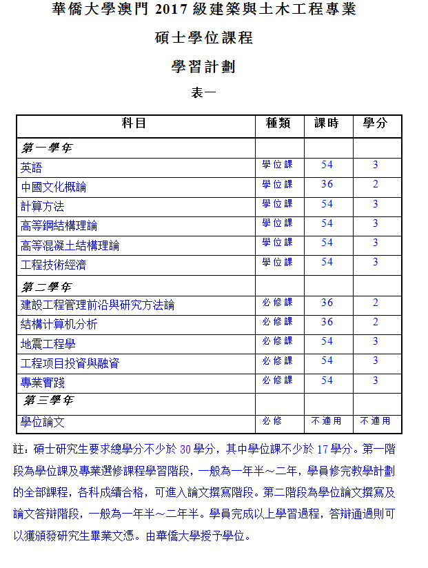 華僑大學澳門2017級建築與土木工程專業碩士學位課程學習計劃