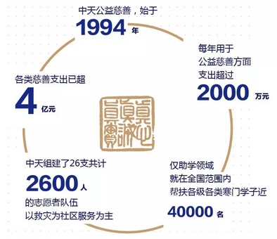 中天公益慈善,始于1994年,并不断持续,“真心、真诚、真实”是我们的原则,“人人可慈善、人人应慈善”是我们的理念,助学助教、扶贫济困、救灾和志愿者服务是我们的活动领域。