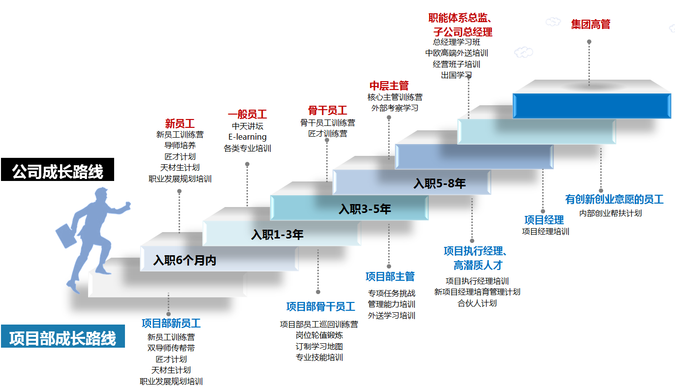 培训:匠才训练营、骨干员工训练营、核心主管训练营、新型项目经理训练营、总经理学习班、中欧学习班、项目部巡回培训营、内部级别鉴定、挂职轮岗锻炼、外部送训、高端讲座论坛、出国学习;