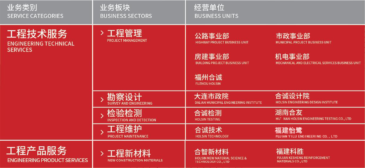 合诚集团积极探索综合交通、智慧城市、绿色环保、行业大数据运用、互联网+工程、行业培训、新材料等业务;以人才开发、技术创新、信息化等核心建设为引领,打造具有国院竞争力的工程全产业生态集团。