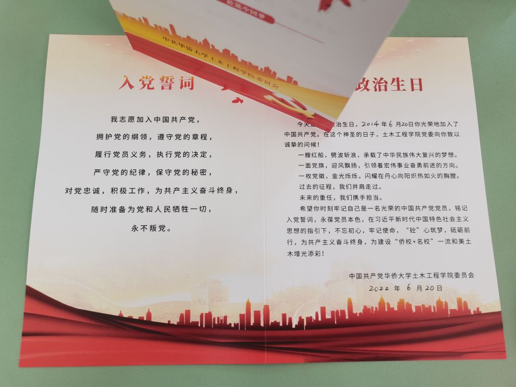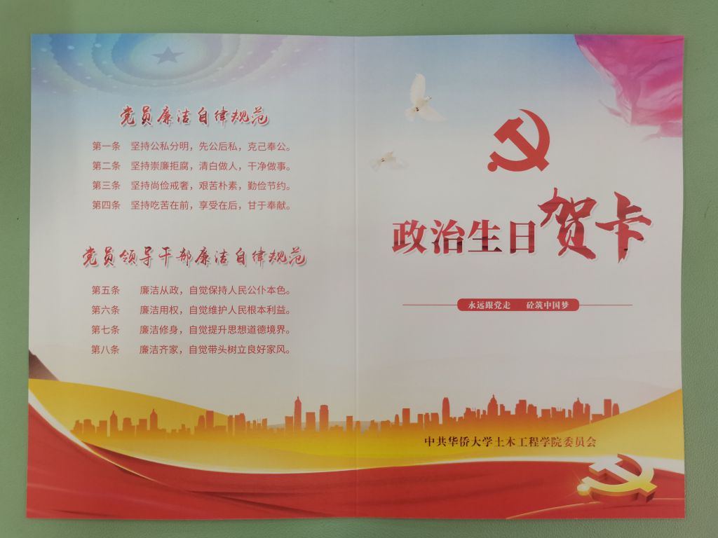 政治生日贺卡外页印有党员廉洁自律规范和党员领导干部廉洁自律规范,意在提醒党员时刻牢记崇廉拒腐,清白做人,干净做事;内页印有入党誓词和每位党员的入党日期,希望每位党员不忘初心、牢记使命,“砼”心筑梦,砥砺前行,为共产主义奋斗终身,为建设“侨校+名校”一流和美土木增光添彩。