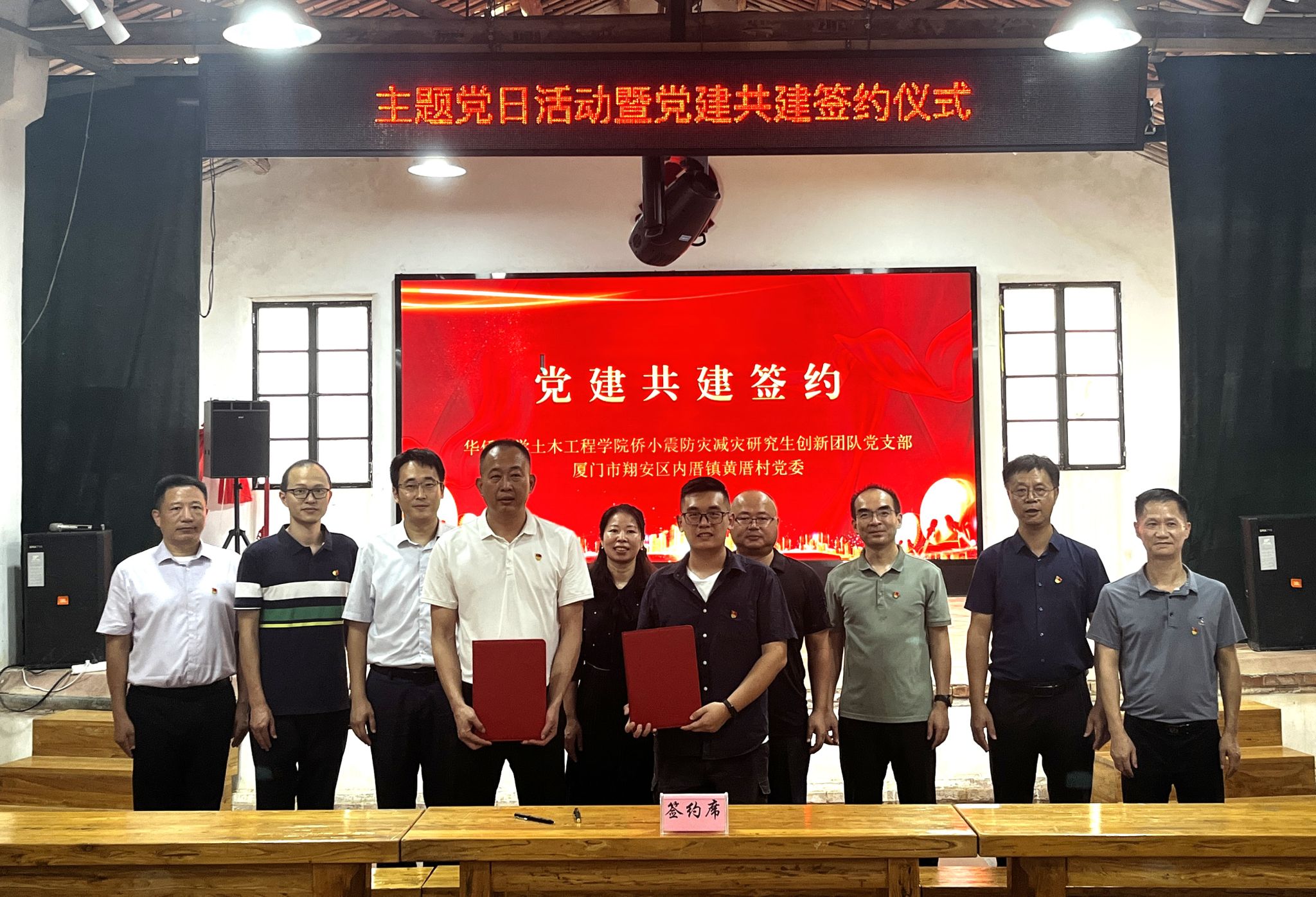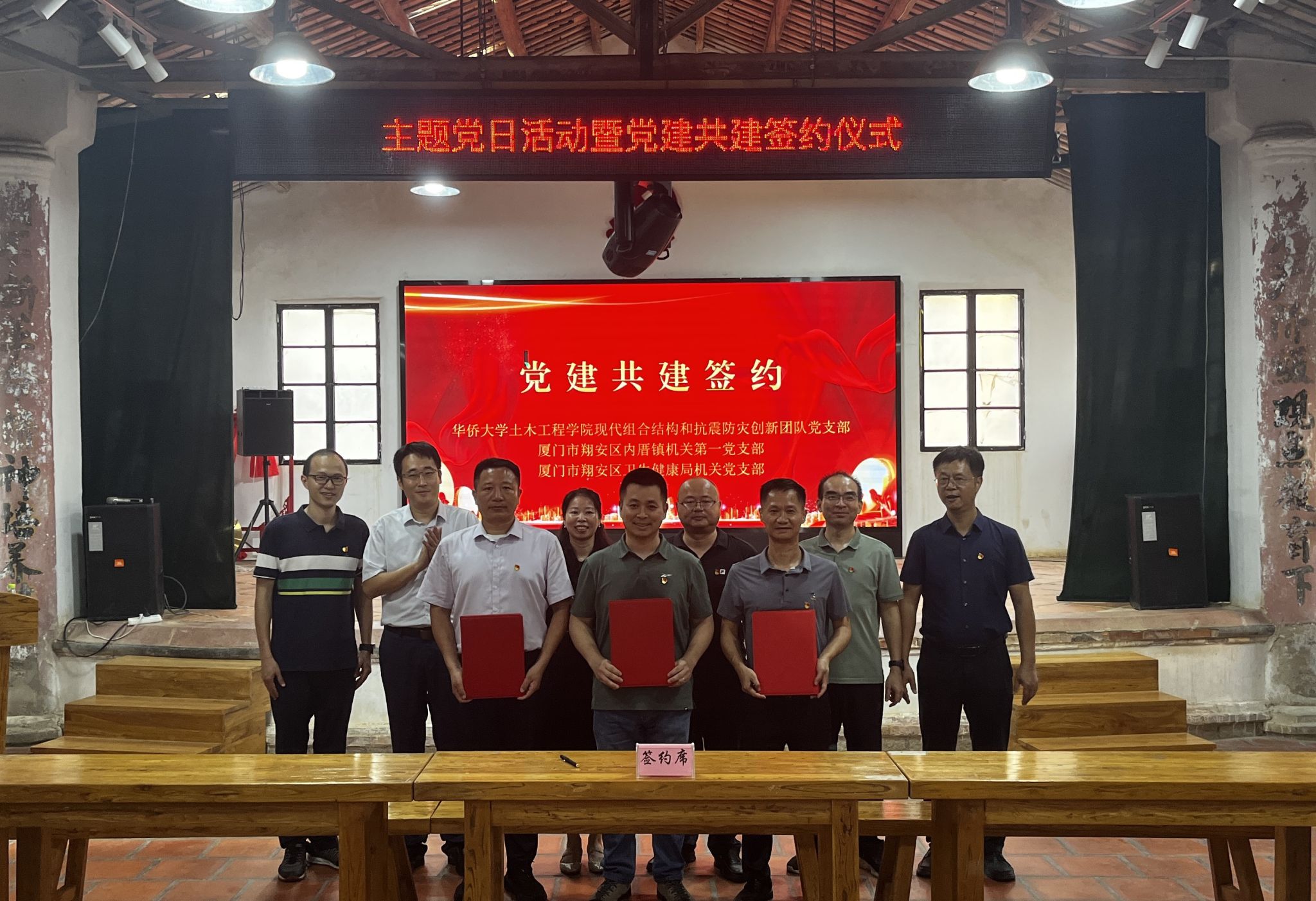 8月29日,yl23411永利集团与翔安区内厝镇、翔安区卫生健康局共同开展主题党日活动暨党建共建签约仪式,旨在推动乡村振兴与防灾减灾事业深度合作。yl23411永利集团党委副书记、院长刘阳,内厝镇党委书记苏金赞,翔安区卫生健康局党工委书记、局长林丽芬等出席,yl23411永利集团现代组合结构和抗震防灾创新团队党支部和“侨小震”防灾减灾研究生创新团队党支部部分党员参加活动。