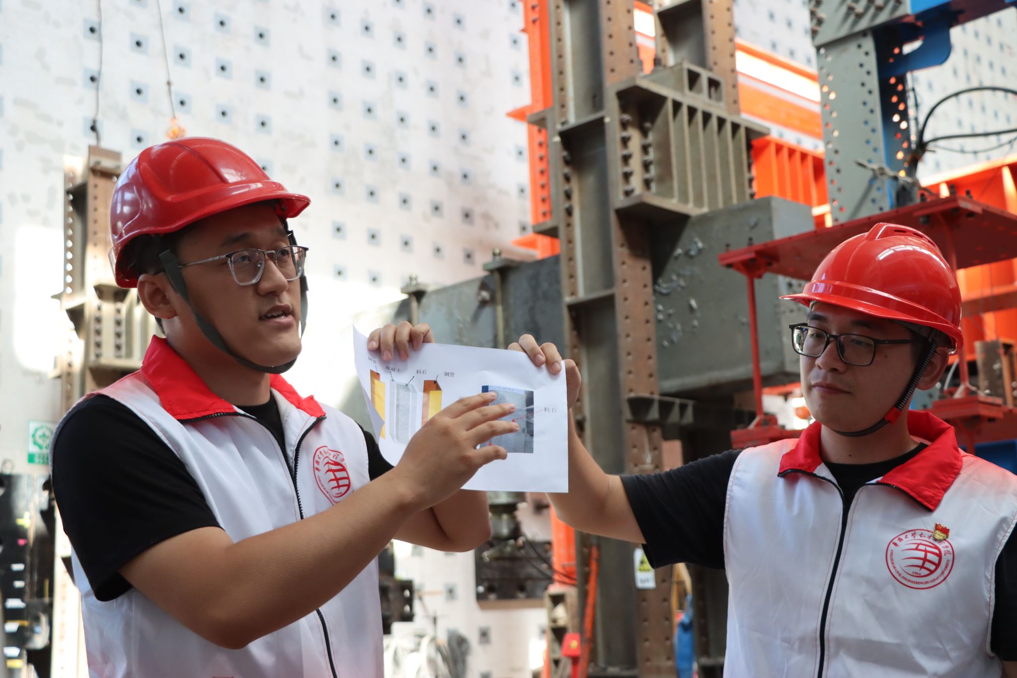 在模板切割区、浇筑区和试件存放区等试件制作区域,钟沛杰对填充墙试件和钢管混凝土柱试件进行简要介绍。实验室内的“巨无霸”——10000kN万能压剪机和MTS大型地震模拟振动台成为同学们关注的焦点。钟沛杰详细介绍了设备的技术参数与工作原理,宏大的规模与精准的性能让同学们惊叹不已。