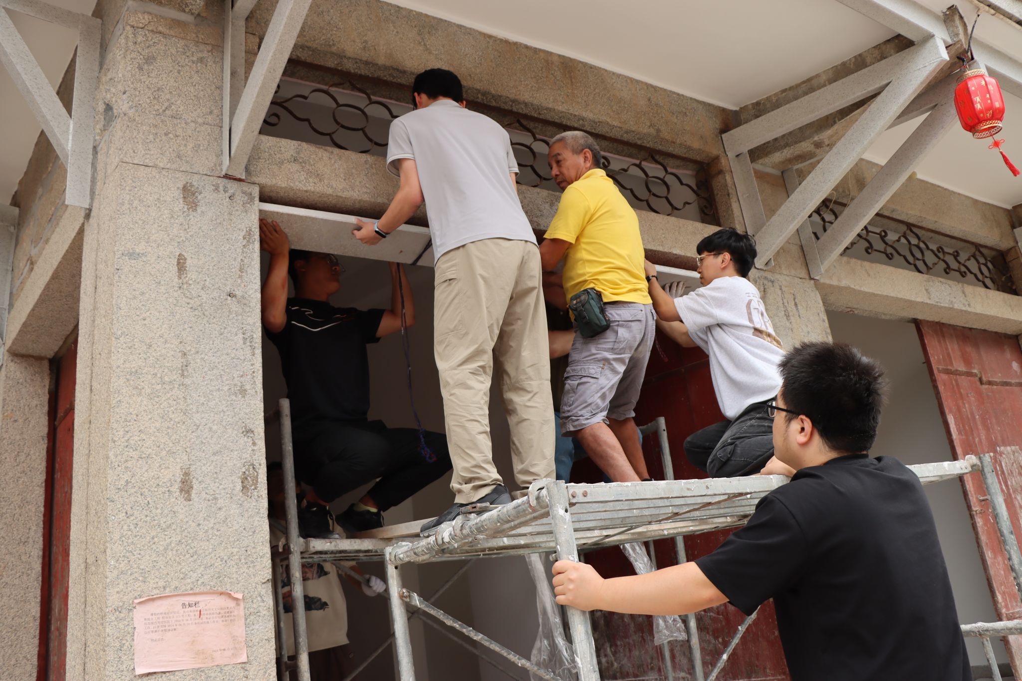 当日,两支部一行人抵达目的地后,即刻着手开展加固作业。参与人员分工明确,协作紧密,有条不紊完成了对断裂石梁的加固。整个加固过程不仅高效迅速,有效提升了该老旧建筑的安全性能,而且对原有建筑外观的影响轻微,保留了石结构建筑的风貌特色,获得项目负责单位和社区居民的高度评价。