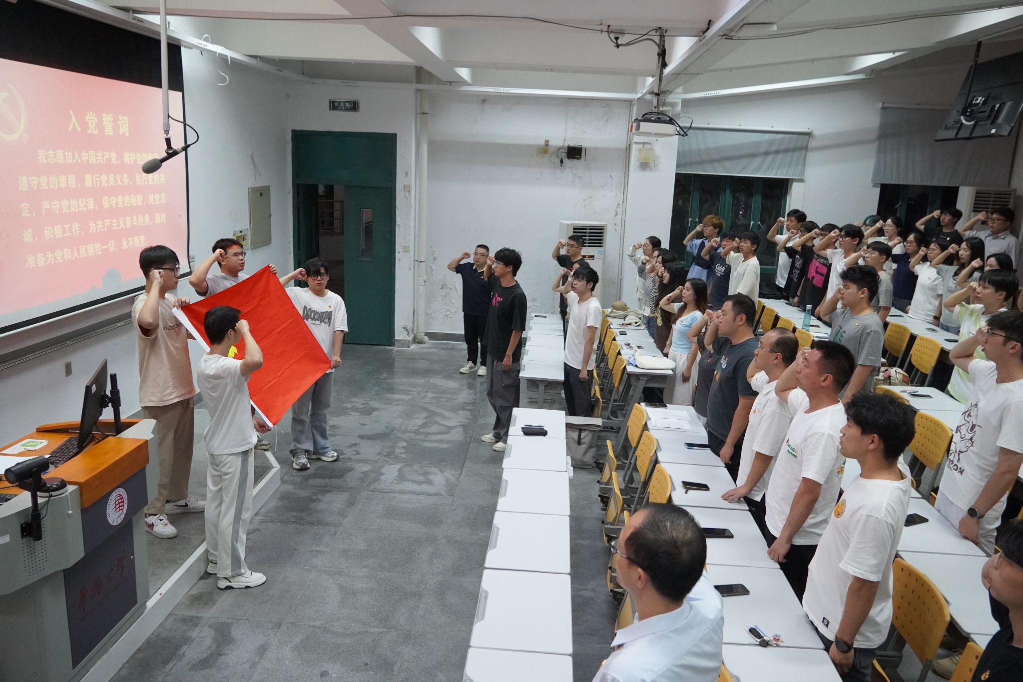 最后,全体与会党员面向党旗,高举右手,重温入党誓词,庄严宣誓——“我志愿加入中国共产党,拥护党的纲领,遵守党的章程……为共产主义奋斗终身,随时准备为党和人民牺牲一切,永不叛党!”