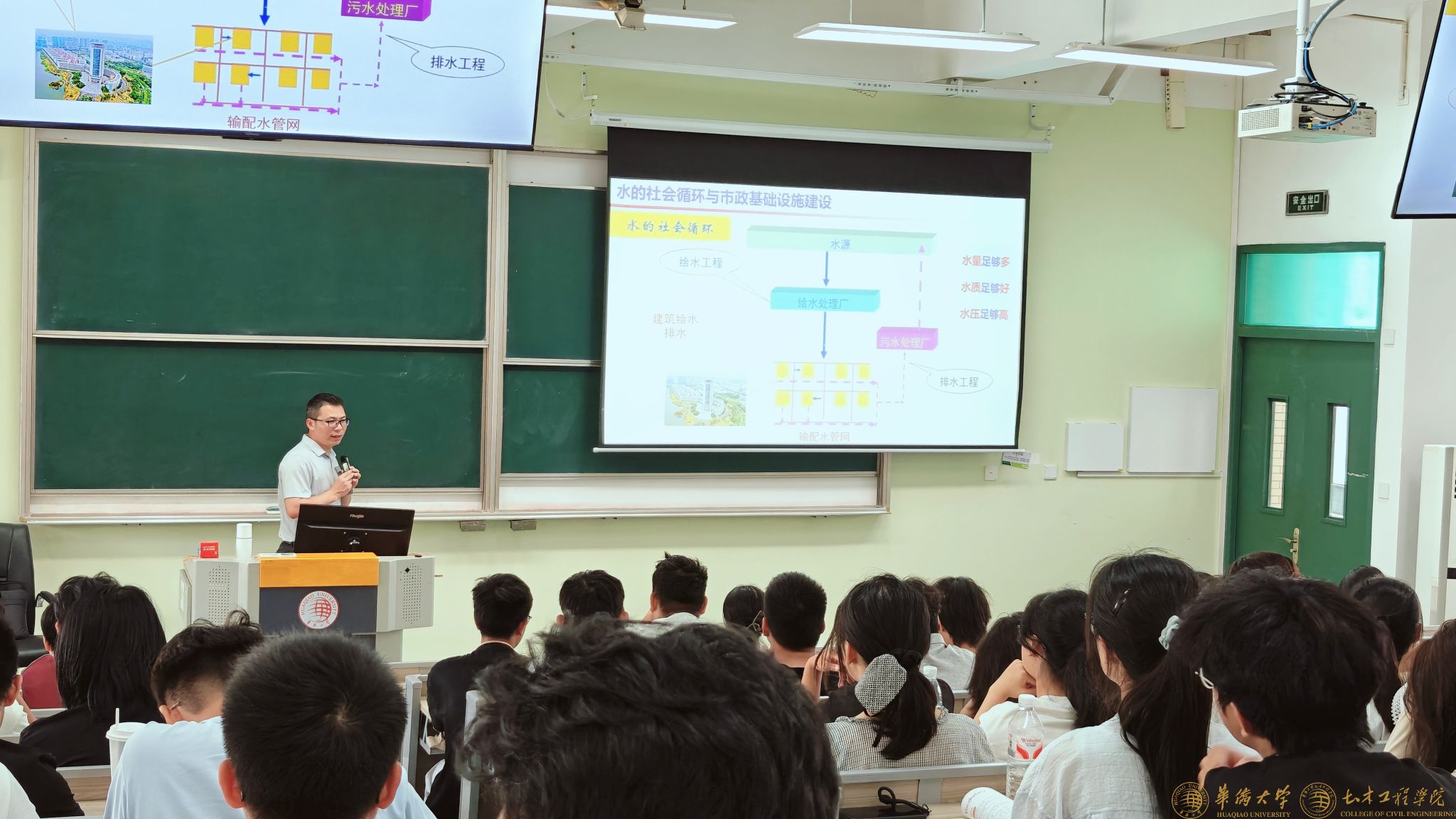 讲座内容围绕水的自然循环与社会循环展开。邹景介绍了包括深度处理、污水厂提标改造、污染监控与溯源、城市黑臭水体治理在内的多项市政基础设施建设关键技术,并结合海绵城市、综合管廊、智慧水务等现代城市水系统建设理念及城市更新背景,全面展现了给排水科学与工程专业在城市化进程中的重要作用。邹景阐述了给排水专业的历史沿革与发展脉络、主干研究方向以及毕业生的就业方向,重点介绍了专业创立以来的师资力量、教学实验环境及人才培养目标,展现了专业特色与发展前景。