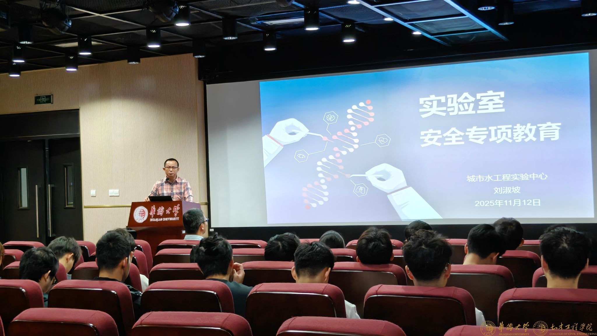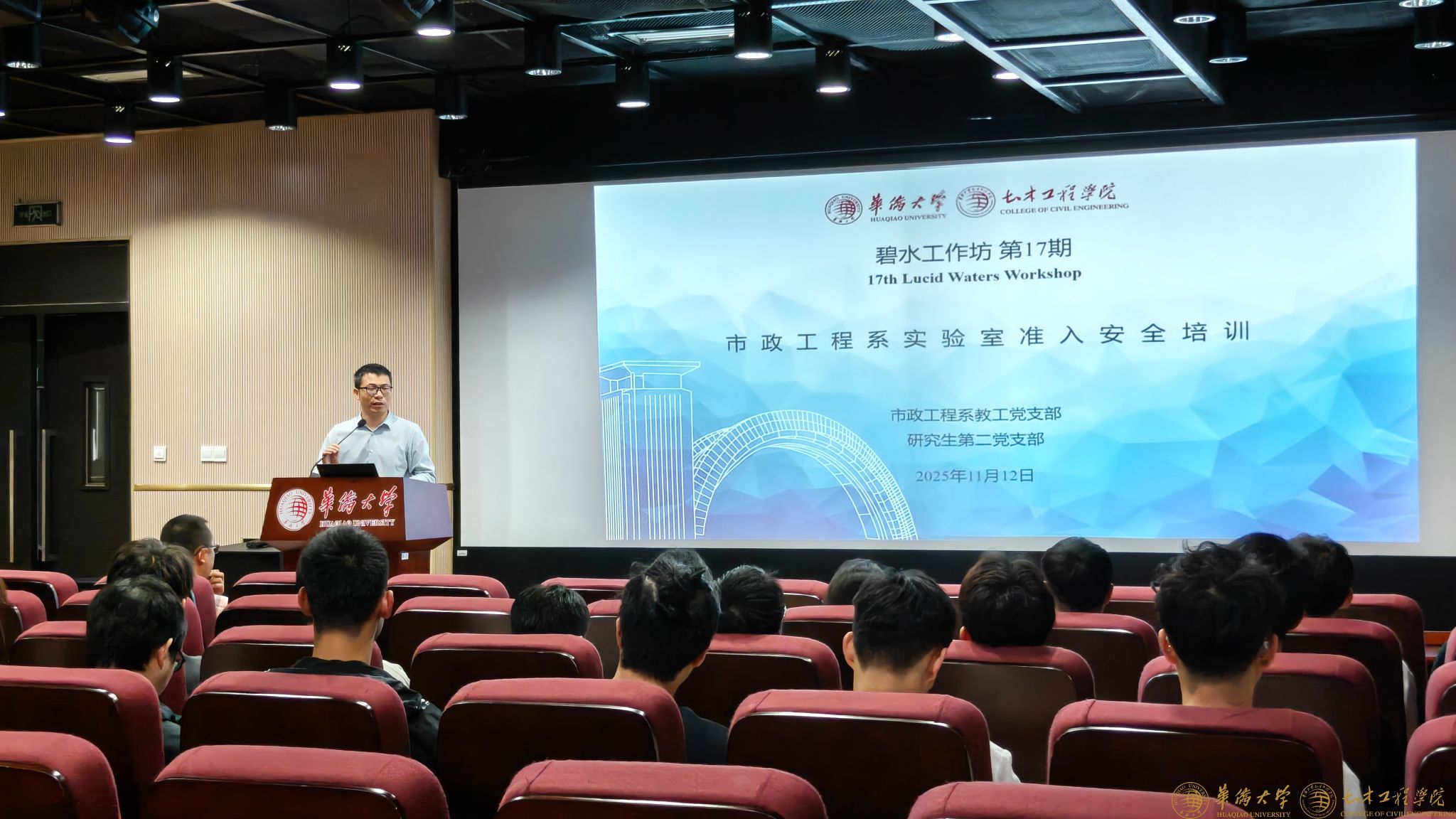 11月12日,市政工程系教工党支部联合研究生第二党支部在土木学科实验大楼510报告厅举办“碧水工作坊”第17期暨实验室准入安全培训主题党日活动。市政工程系全体研究生参加活动,市政工程系教工党支部书记、系主任邹景教授主持活动,支部党员、高级实验师刘淑坡作实验室安全专项教育培训。