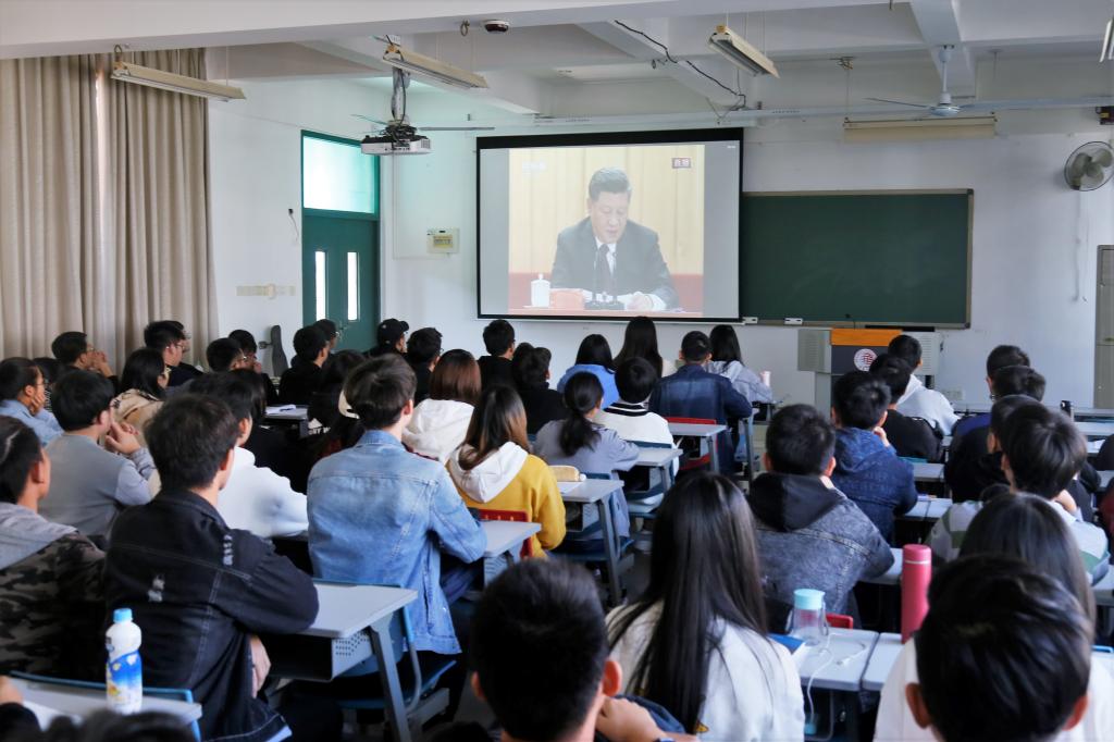“建成社会主义现代化强国,实现中华民族伟大复兴,是一场接力跑,我们要一棒接着一棒跑下去,每一代人都要为下一代人跑出一个好成绩。全党全国各族人民要更加紧密地团结在党中央周围,高举中国特色社会主义伟大旗帜,不忘初心,牢记使命,将改革开放进行到底,不断实现人民对美好生活的向往,在新时代创造中华民族新的更大奇迹!创造让世界刮目相看的新的更大奇迹!”现场师生认真聆听并记录着习近平总书记的讲话精神,不时以热烈的掌声回应大会报告的精彩之处。