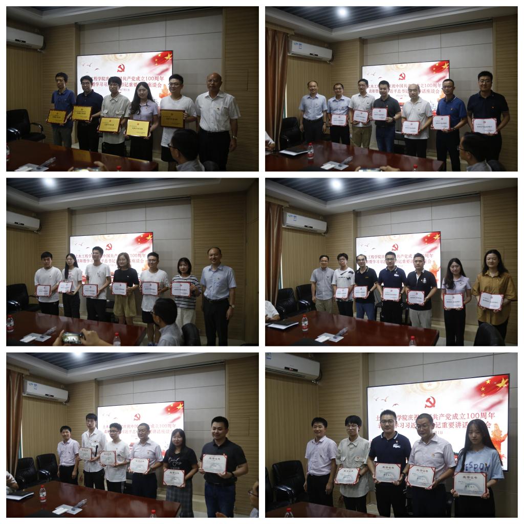 会议在激昂的《国歌》声中拉开序幕。会议表彰了现代组合结构和抗震防灾创新团队党支部、本科生第八党支部等5个“先进党支部”、叶勇、冯龙辉等20名“优秀共产党员”、王卫华、朱柏林等8名“优秀党务工作者”,宁西占、黄思谋等40名“党史知识竞赛获奖者”和罗兵、赵珧冰等22名学习强国“学习达人”。学院党委书记张灯,党委委员李海锋、蔡奇鹏和祁神军分别为先进党支部和优秀个人代表颁奖。