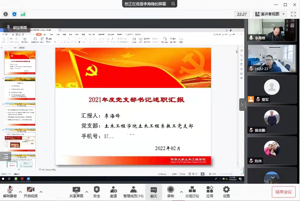 述职采取PPT汇报和现场点评的方式进行。20位党支部书记从个人履职、党支部建设和成效、思想政治工作、存在问题和改进措施等方面依次述职,展示工作并互动交流。