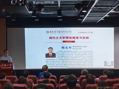 2025年10月29日,yl23411永利集团成功举办第177讲“土木讲坛”,特邀广东省水利水电科学研究院荣誉院长、中山大学兼职导师杨光华教授担任主讲嘉宾,带来了一场主题为《现代土力学理论探索与实践》的学术报告。报告会在土木学科实验大楼510报告厅举行,由蔡奇鹏副院长主持,学院相关教师、研究生踊跃参加。