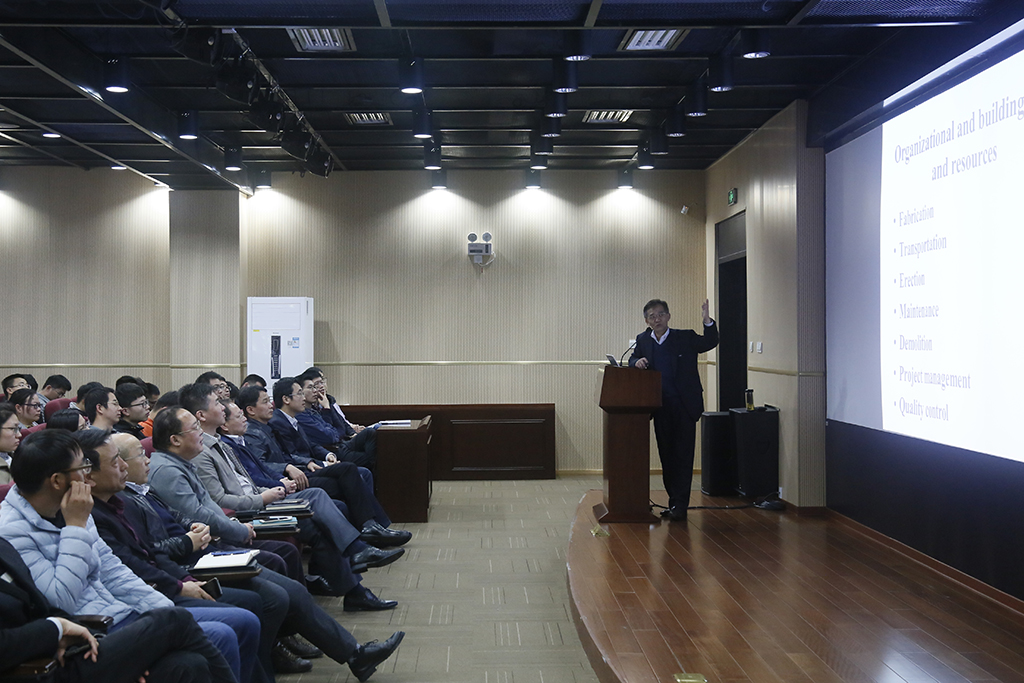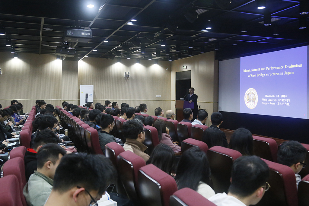 葛汉彬教授首先简要介绍了日本高等教育与土木工程专业的发展状况,然后从1995年1月日本阪神大地震后土木工程结构灾后调查的第一手资料出发,详细分析了都市直下型地震作用下钢结构桥梁的典型破环特征及原因,介绍了其研究团队近年来在钢桥结构的补强、耗能减震与抗震性能评估等方面的最新研究进展及工程应用实例,特别是采用防屈曲支撑及部分充填混凝土的钢结构抗震性能提升技术引起大家广泛兴趣。报告会上,葛汉彬与在座师生进行了交流互动,会场学术气氛热烈。
